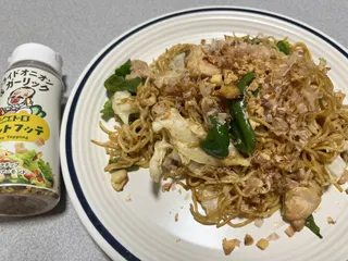 パットフッテチャレンジ48日目 【48日目】焼きそば! またまた登場の焼きそば家族皆んな大好きでーす。仕上げに花鰹とパットフッテ! パットフッテ、永遠振ってしまいます笑