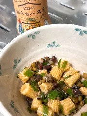 おうちパスタを使っておつまみ 某飲食店で出てきた突き出しのお味が良かったので、再現してみました。 パウチ売りされているキユーピーのヤングコーンをぶつ切りし、「ごま醤油ガーリック」と和えるだけ 同じくキユーピーの雑穀も入れ、もち麦プラスです。ここまでがお店の材料。プラス青ネギを刻み混ぜました。&nb