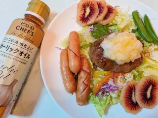 和風ハンバーグを作ってガーリックオイルをかけて大根おろしに少しのお醤油+野菜もガーリックオイルで美味しく頂けました美味しいと家族も喜んでいました。