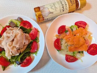 ピエトロシェフ・ガーリックオイル ピエトロシェフ・ガーリックオイルでサラダドレッシングとして豚しゃぶサラダとサーモンドサラダ作ってみましたどちらに合うかなぁと両方食べてみましたどちらにも美味しいお塩少々かけてガーリックオイルをかけて食べましたどちらも美味しかったです洋食でも和食でも合いますガーリックの香ばしさと🌶の風味も美味しかった