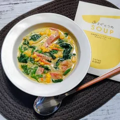 アレンジコーンスープ 「北海道産スイートコーンの甘みポタージュ」に具材を足しました。野菜室に残っていたほうれん草、にんじん、玉ねぎ、ブロックベーコンを炒め、軽く塩胡椒で味付け、そこにコーンスープを流しました。スープにコーンが入っているのを忘れていて💦缶のコーンも入れていたからコーンまみれに😆