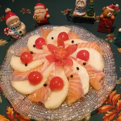 サーモンとラ・フランスのカルパッチョ サーモンとラ・フランスのカルパッチョに生胡椒をトッピング。ベランダのレモンのドレッシングをかけました😋
