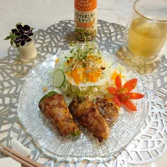 晩ごはんのサラダに✨ 【14日目】サラダにパットフッテをかけました😋ビーマンにピザ用チーズを入れ、豚肉で巻いてソテーしたものです😊