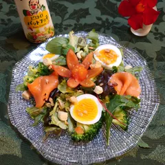 【94日目】サラダに、ゆで卵、みミニトマト、スモークサーモン、クルトンをトッピングしました😋