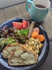 朝食です。グリーンのカロリーハーフドレッシングをかけていただきました。オレンジのドレッシングが好きなのですが、健康のため最近はカロリー少なめのものにしています。お酢がきいてさっぱりとしているのでサラダが食べやすいです。
