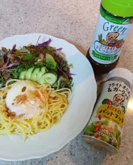 グリーンサラスパ パットフッテチャレンジ18日目 【18日目】冷したグリーンサラダとスパゲッティに半熟卵をトッピング更にパットフッテフライドオニオン&ガーリックをかけてピエトロドレッシンググリーン和風しょうゆでいただきました☺️
