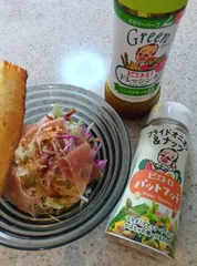 大根とレタスと紫キャベツのサラダ 【23日目】野菜の千切りサラダに生ハムトッピングしてピエトロドレッシンググリーンをかけてパットフッテフライド&ナッツを😊