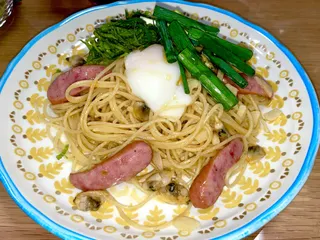 半熟卵のトッピング)【写真上=あきたん作。写真下=ピエトロレストラン作】今回、実家でお披露目のやまちゃんカスタマイズパスタ✨️先日、午後半休&2連休で実家に帰省した時にやまちゃんおすすめカスタマイズパスタ✨️ソーセージと青じそのペペロンチーノにあさり&半熟卵トッピング♪ 私が作って、両親