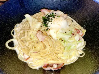 イベリコベーコンと春キャベツと半熟卵のクリームソース