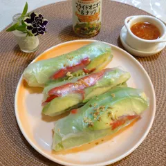生春巻きにパットフッテ✨ 【19日目】生春巻きにパットフッテをかけました😋レタス、フルーツパプリカ、アボカドを巻きました💓