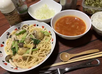 NEW ピエトロのパスタソースで〜♬栗のパスタ カニカマ🦀しめじ、栗、ちんげん菜をピエトロさんのパスタソースでパスタにしました(o^^o)美味しくできました(*≧∀≦*)ミネストローネは時間がなかったので玉ねぎとキャベツの具ですが夏のうちに甘いフレッシュトマトを🍅冷凍しておいたものだったので甘い✨ついつい食べすぎちゃいました💦