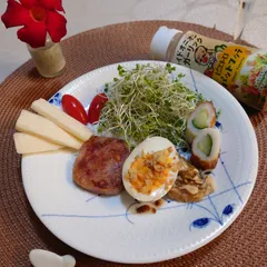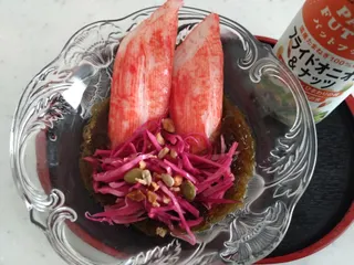 84日目モズク酢と紫キャベツ 【84日目】 レンチン紫キャベツともずく酢、カニカマにパットフッテをかけていただきました