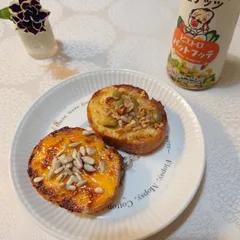 おつまみトーストにパットフッテ 【20日目】冷凍したフランスパンに、2種類のマヨネーズを塗って、一つはひまわりの種、もう一つはパットフッテをかけました😋