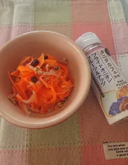 キャロット🥕ラペにPATFUTTE♪ 【14日目】ピーラーにんじんに常備菜の「酢・たまねぎ」をあわせて、キャロットラペに~から焼きくるみとパットフッテ♪ドライフルーツの甘さと香ばしさが引き立ちます🤗
