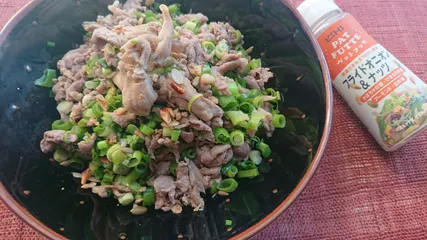 豚肉ときのこの黒酢炒めにPATFUTTE ♪ 【17日目】豚肉、椎茸、舞茸を黒酢、オイスターソース、紹興酒で炒め、九条ネギを山盛りドサ~ッ!PATFUTTEのナッツとフライドオニオンが香ばしい😆👍️ご飯もビールもすすみます😋